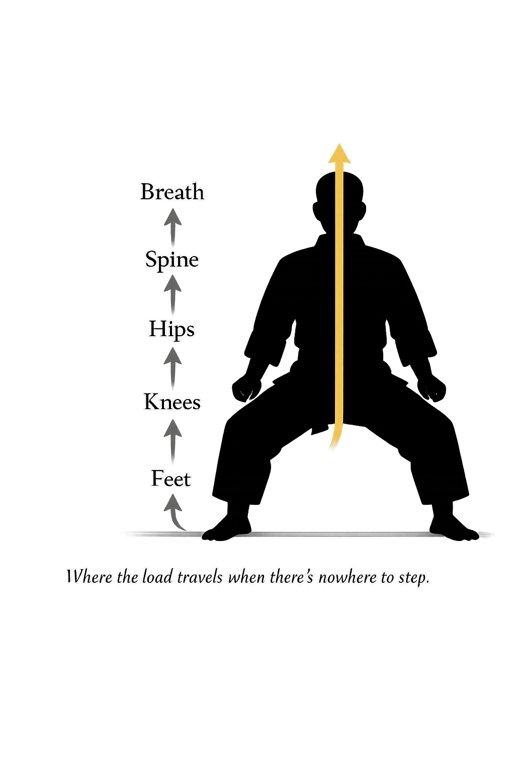 Everything begins at the floor. The feet are planted parallel, distributing pressure evenly from heel to ball, neither clawing nor collapsing. This is not the forward-driving pressure of a fighting stance, but a lateral grounding that asks the legs to support weight without the luxury of stepping. The floor becomes an uncompromising witness. Shift too much into the toes or let the arches cave, and the error is immediately revealed.